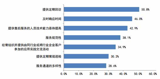那么在售后服务中,用户希望得到OA厂商的什么服务及帮助呢?在2015年年末,调查报告给出了具体答案,如图所示: